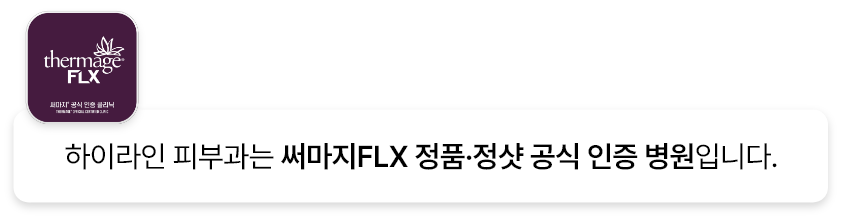 시간을 거스르는 리프팅 효과, 써마지 FLX 써마지FLX는 고주파(RF, Radio Frequency) 에너지를 이용하여 피부의 콜라겐 재생을 촉진하고 탄력을 강화하는 비수술적 리프팅 시술입니다. 피부 표면을 손상시키지 않으면서 진피층 깊숙이 강한 열 에너지를 전달하여 즉각적인 리프팅 효과와 장기적인 콜라겐 리모델링을 유도합니다. 하이라인피부과는 기존 써마지FLX에서 하이라인 피부과만의 노하우를 결합시켜 빈틈없는 탄력 케어를 경험해보세요. |
